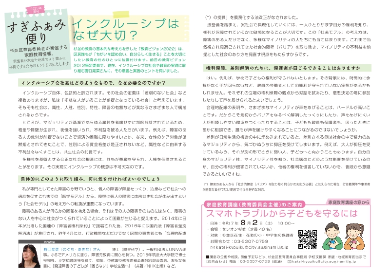 杉並の教育の基本的な考え方を示した「教育ビジョン2022」は、区民誰もが「ちがいを認め合い、自分らしく生きる」ことを大切にしたい教育の柱のひとつに位置付けます。前回の教育ビジョン2012策定委員で、現在、インクルーシブな社会や教育の実現に取り組む野口晃菜さんに、その意義と実践のヒントを伺いました。